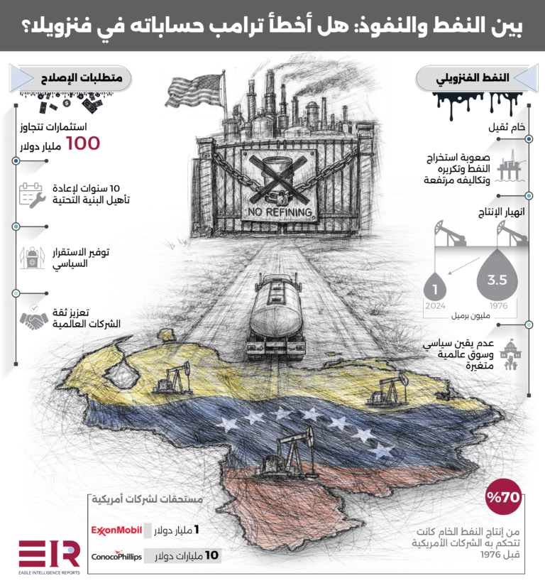 تركت الغارة العسكرية الأمريكية التي أطاحت بزعيم فنزويلا نيكولاس مادورو تأثيراً تكتيكياً كبيراً، خاصة مع وعد الرئيس الأمريكي دونالد ترامب، بأن الولايات المتحدة ستجني مليارات الدولارات من النفط الفنزويلي، لكن هذا الهدف اصطدم بواقع اقتصادي معقد.