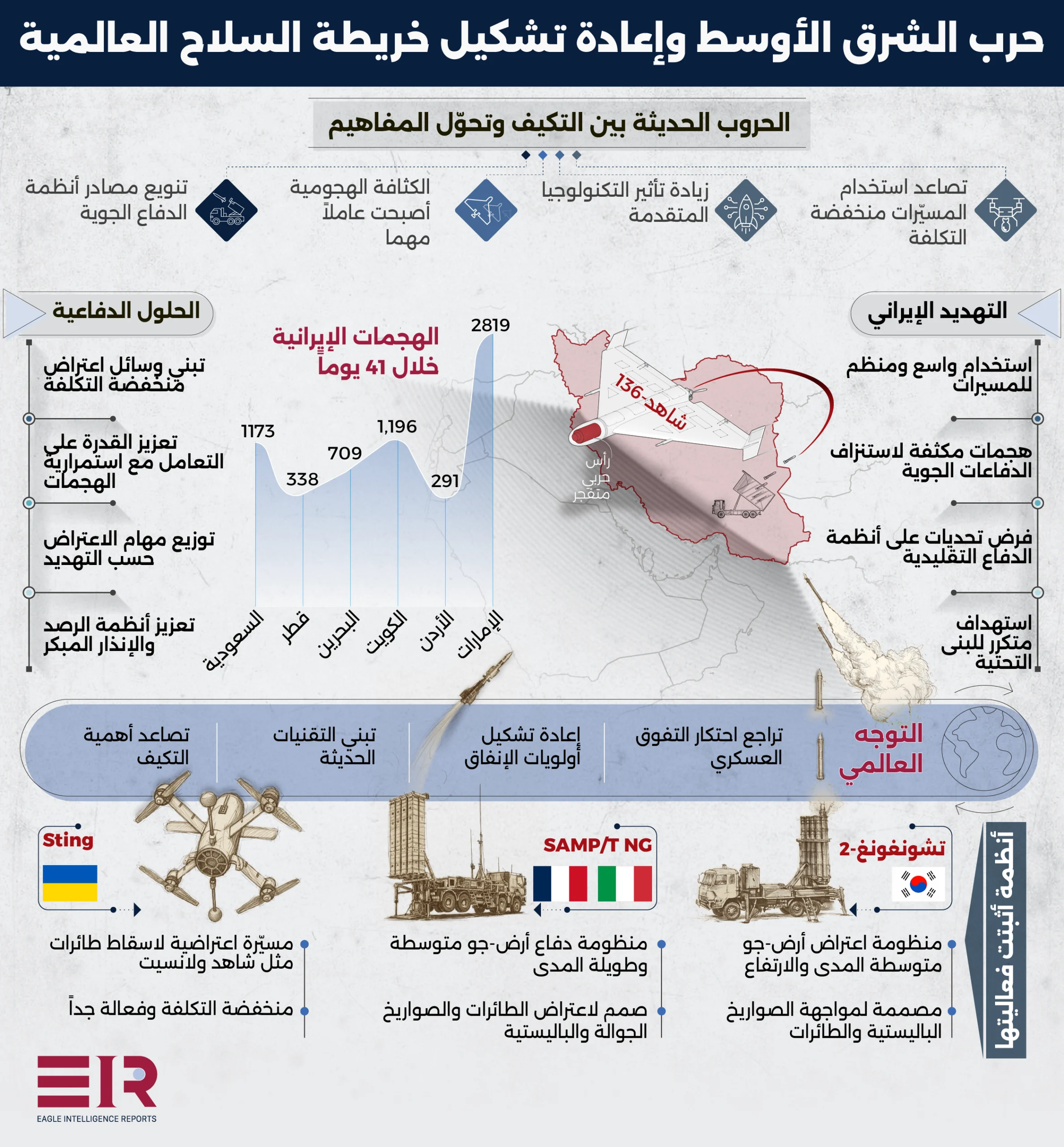 وعليه، لم يعد الرد الدفاعي يعتمد على نظام واحد متقدم، بل يتجه نحو بناء منظومات متعددة الطبقات، تجمع بين حلول عالية الكفاءة وأخرى منخفضة التكلفة، مثل المسيّرات الاعتراضية، وإدخال أنظمة دفاعية جديدة بهدف تحقيق توازن بين سرعة الاستجابة وكلفة الاعتراض، وتنويع مصادر السلاح.