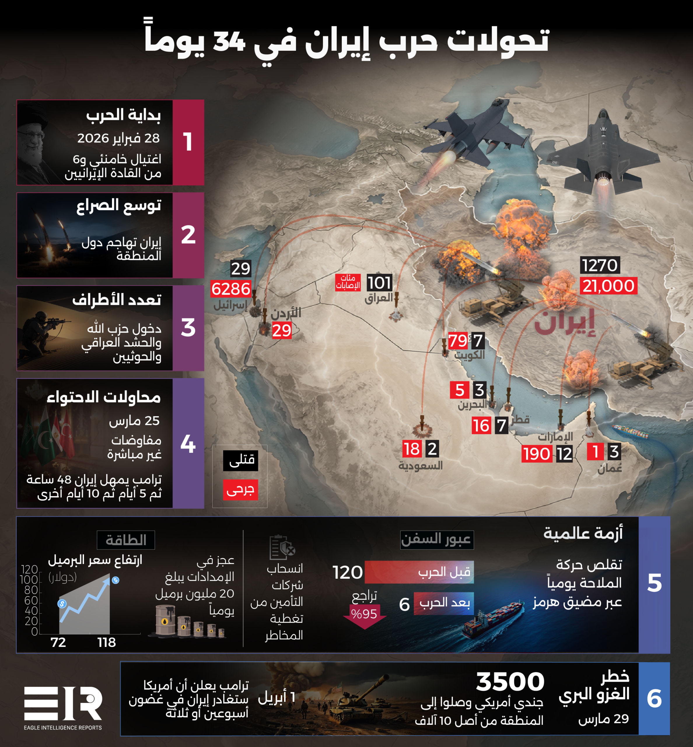 اليوم، تتكشف تحولات هذه الحرب على مستويات متعددة؛ إذ شهدت أسواق الطاقة تقلبات حادة، وارتفع سعر برميل النفط بأكثر من 60% منذ 28 فبراير الماضي، بالتزامن مع بدء الهجوم، كما سُجِّل عجز في الإمدادات يُقدَّر بنحو 20 مليون برميل يومياً، مع صعود سعر البرميل من 72 دولاراً قبل الحرب إلى نحو 118 دولاراً حالياً.