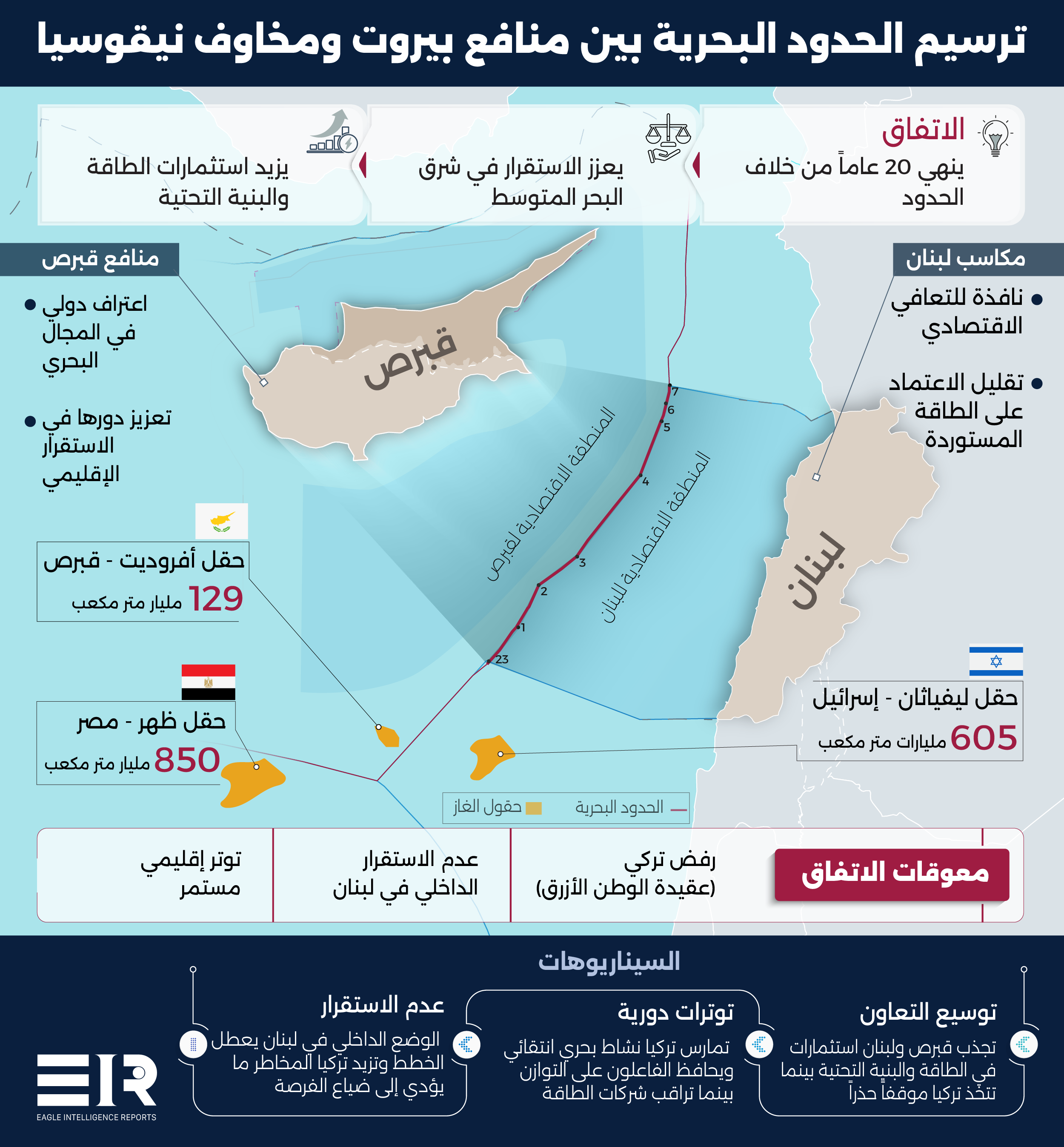 بالنسبة إلى نيقوسيا، يمثّل هذا الاتفاق خطوة إضافية في مساعيها الحثيثة لإرساء إطار قانوني متماسك ومعترف به دولياً في المجال البحري، بما يعزّز دورها كفاعلٍ مُسهم في الاستقرار الإقليمي، أمّا بالنسبة إلى بيروت، فيفتح الاتفاق نافذة نادرة للتعافي الاقتصادي في وقت يغرق فيه البلد في أزمة سياسية واقتصادية متعددة الأبعاد.