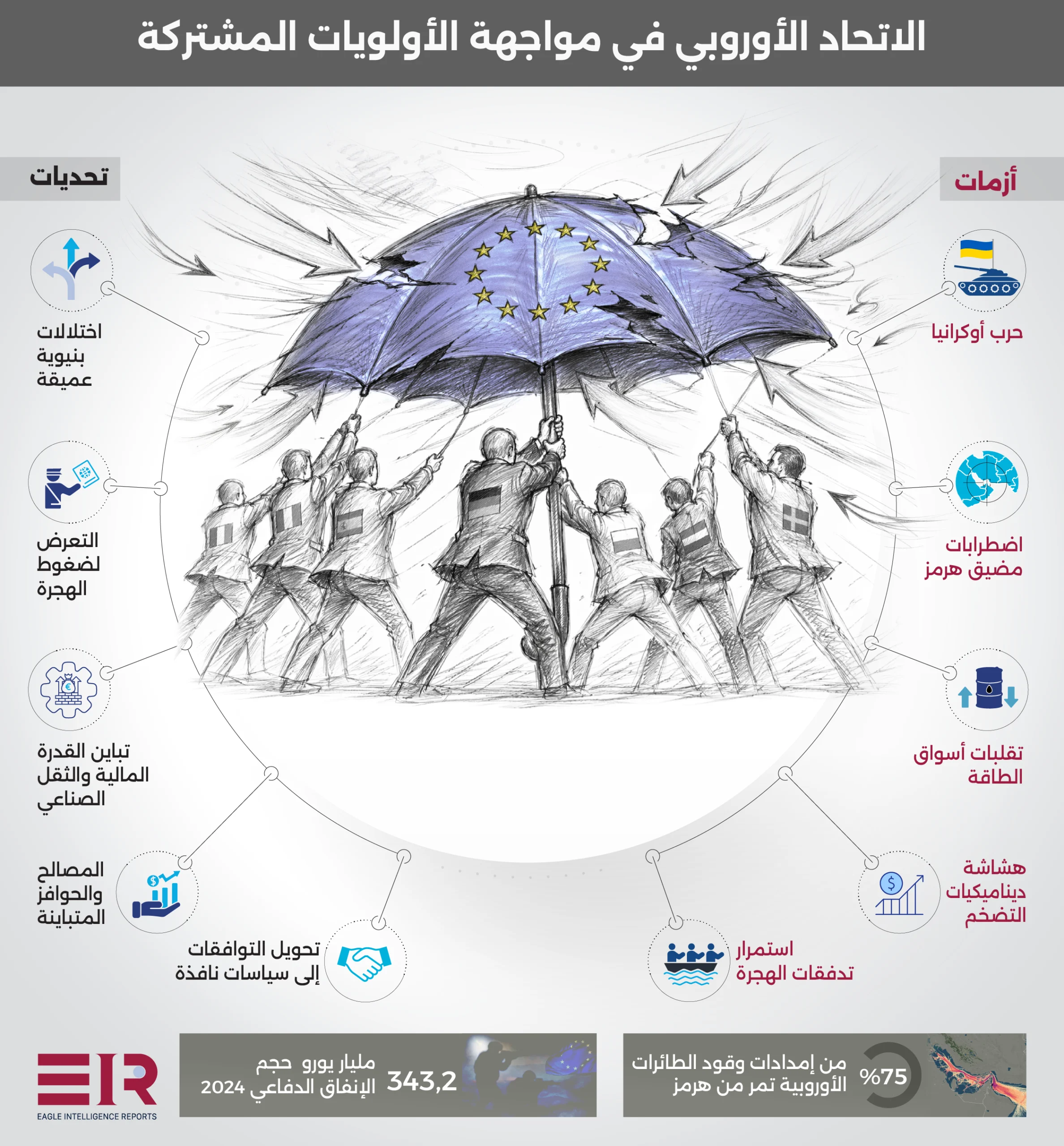 يواجه الاتحاد الأوروبي جملة من الأزمات والضغوط التي تختبر قدرته في الحفاظ على تماسكه السياسي والاقتصادي، فمن الخارج، تتصدر تداعيات حرب أوكرانيا المشهد، واضطرابات مضيق هرمز، بينما يعاني من الداخل تحديات هيكلية تشمل استمرار ضغوط الهجرة، وتفاوت القدرات المالية والصناعية بين الدول الأعضاء، لقراءة التحليل كاملاً اضغط هنا.