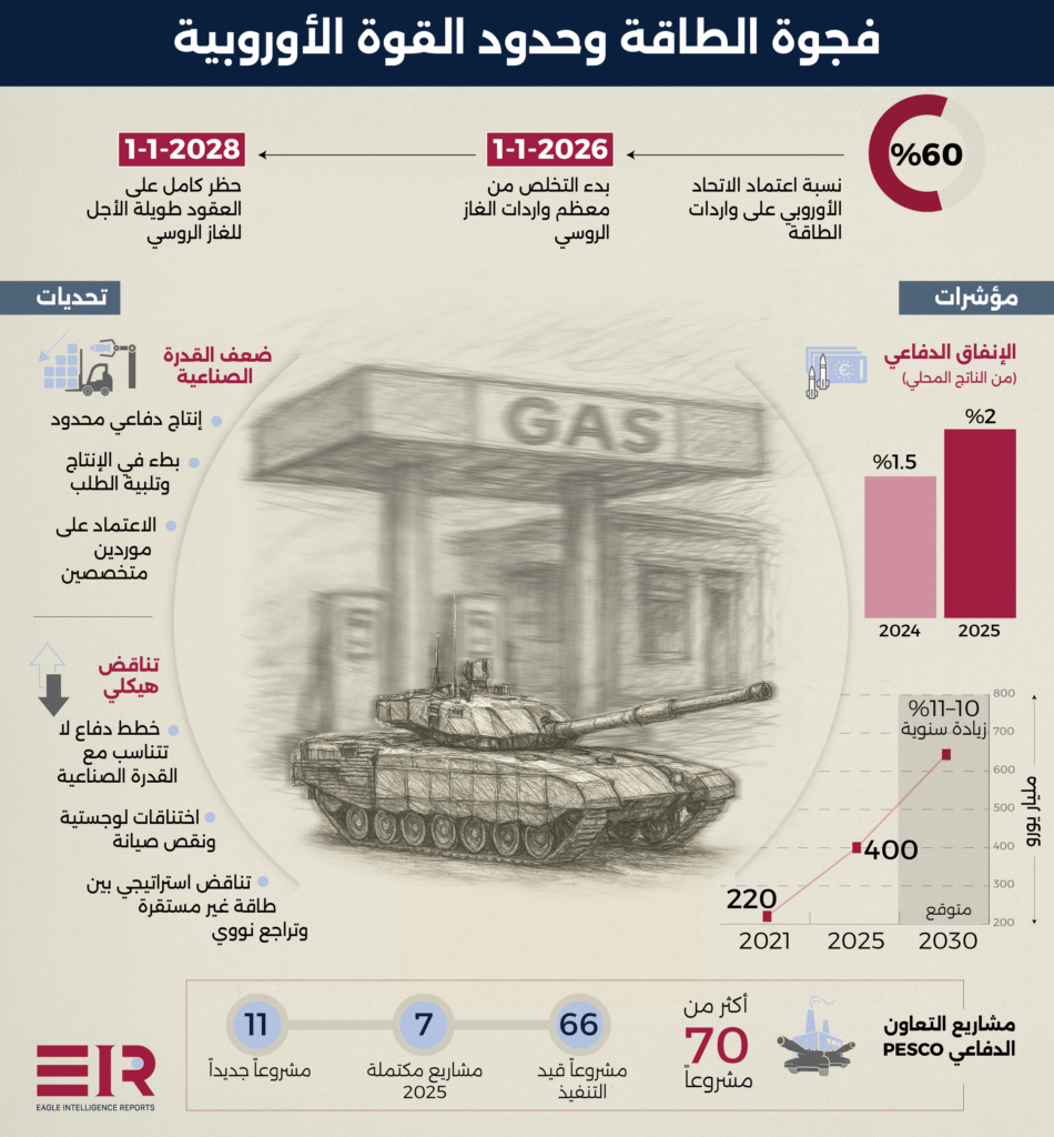 كما ساهمت خطة الاتحاد الأوروبي للطاقة REPowerEU في تسريع جهود التنويع، من خلال إبرام اتفاقات لوقف واردات الغاز الروسي اعتباراً من 1 يناير 2026 لمعظم العقود، وفرض حظر كامل على الواردات طويلة الأمد بحلول 1 يناير 2028، وذلك عبر تقليص الاعتماد على روسيا من خلال زيادة واردات الغاز الطبيعي المسال وتوسيع استخدام مصادر الطاقة المتجددة، إذ تزداد هشاشة البنية الصناعية الأوروبية وضوحاً عند تقييم واقع قاعدة الإنتاج الدفاعي المجزأة في القارّة.
