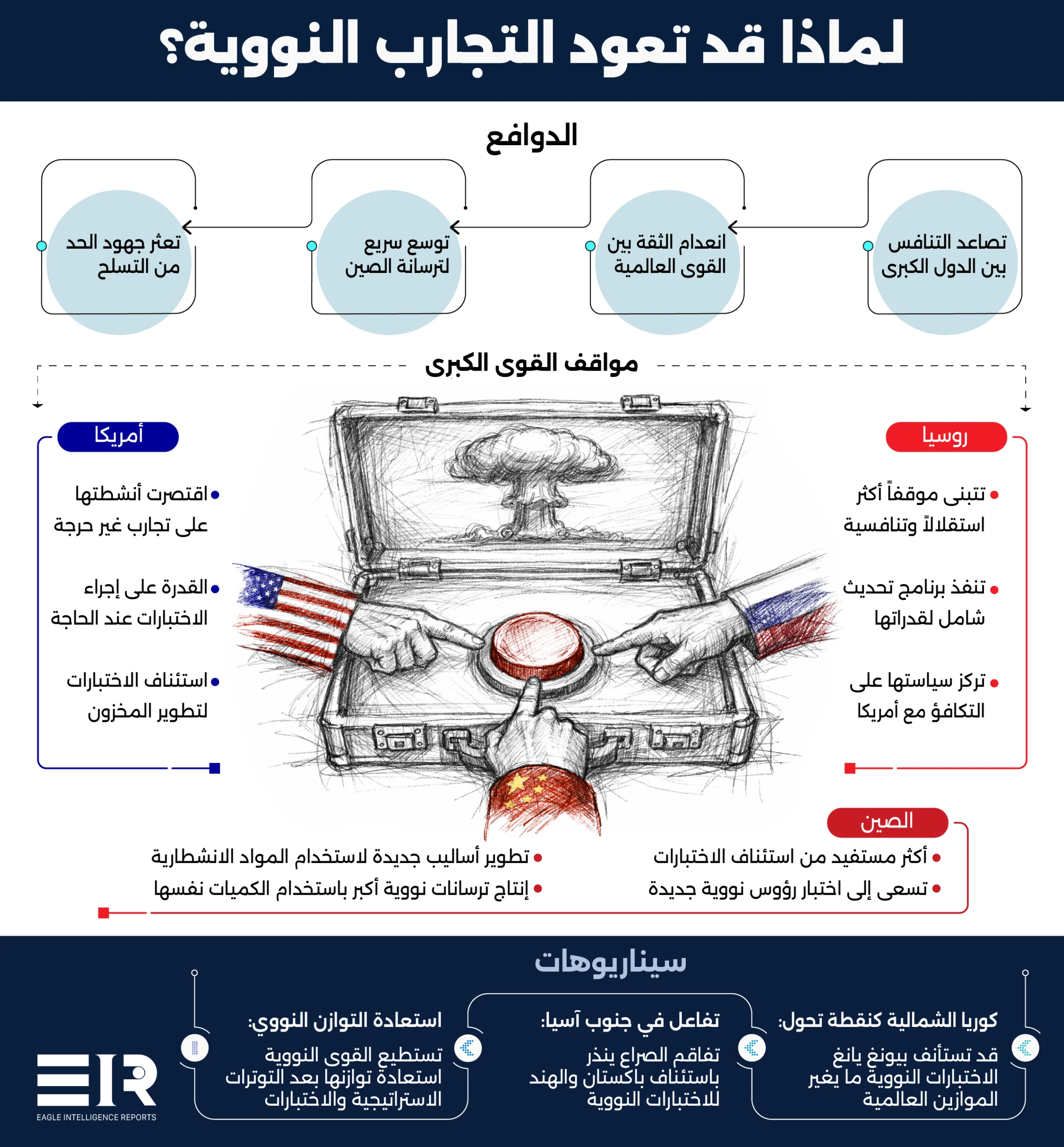 يعتمد الوقف العالمي للتجارب النووية إلى حد كبير على ضبط النفس الطوعي بدلاً من الالتزامات القانونية الملزمة، إلا أن احتمال استئناف الاختبارات يعكس تحولات أوسع في ميزان القوى العالمي، لقراءة التحليل كاملا اضغط هنا.