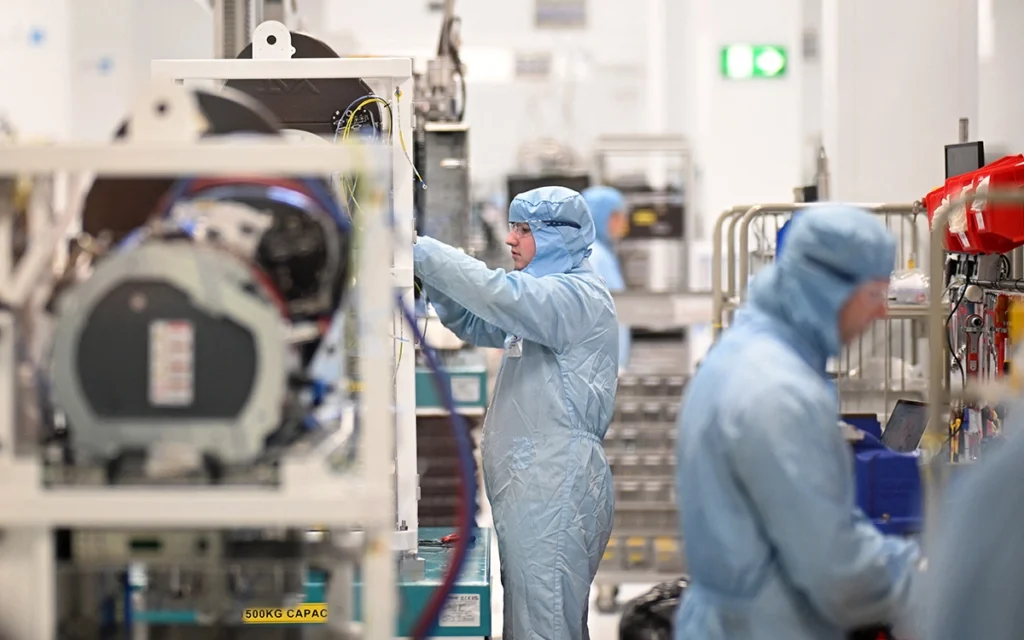 عمال في مصنع أشباه الموصلات في مدينة نيوبورت، ويلز، بريطانيا (أ ف ب)