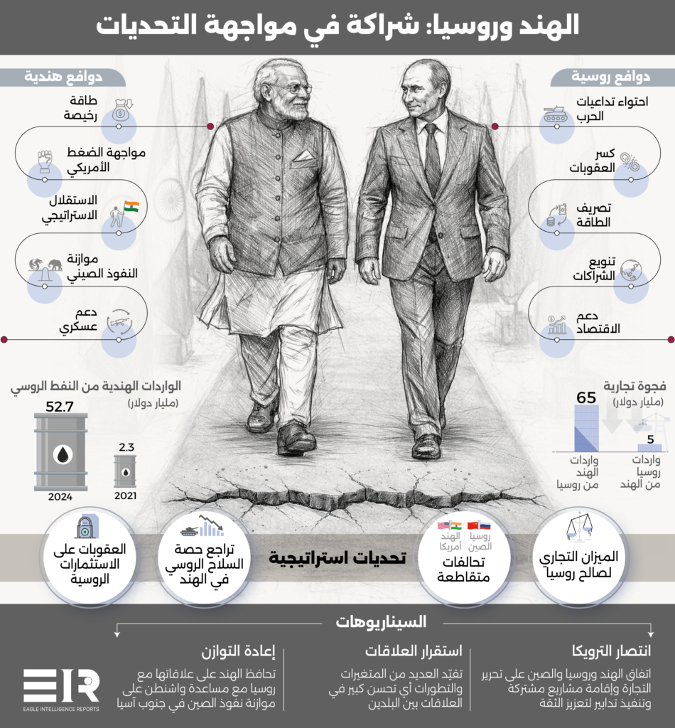هناك العديد من المتغيرات التي قد تحد من التقدم الكبير في العلاقات الروسية–الهندية، فقد تضطر نيودلهي، لأسباب جيواقتصادية، إلى تقليص وارداتها من النفط الروسي، كما أن تقليل الاعتماد على التقنيات الدفاعية الروسية الخاضعة للعقوبات سيوسع الفرص أمام قطاع الدفاع الهندي، بالإضافة إلى ذلك، قد تستغل الصين نفوذها على روسيا لإجبار موسكو على خفض مبيعاتها من الأسلحة إلى الهند.