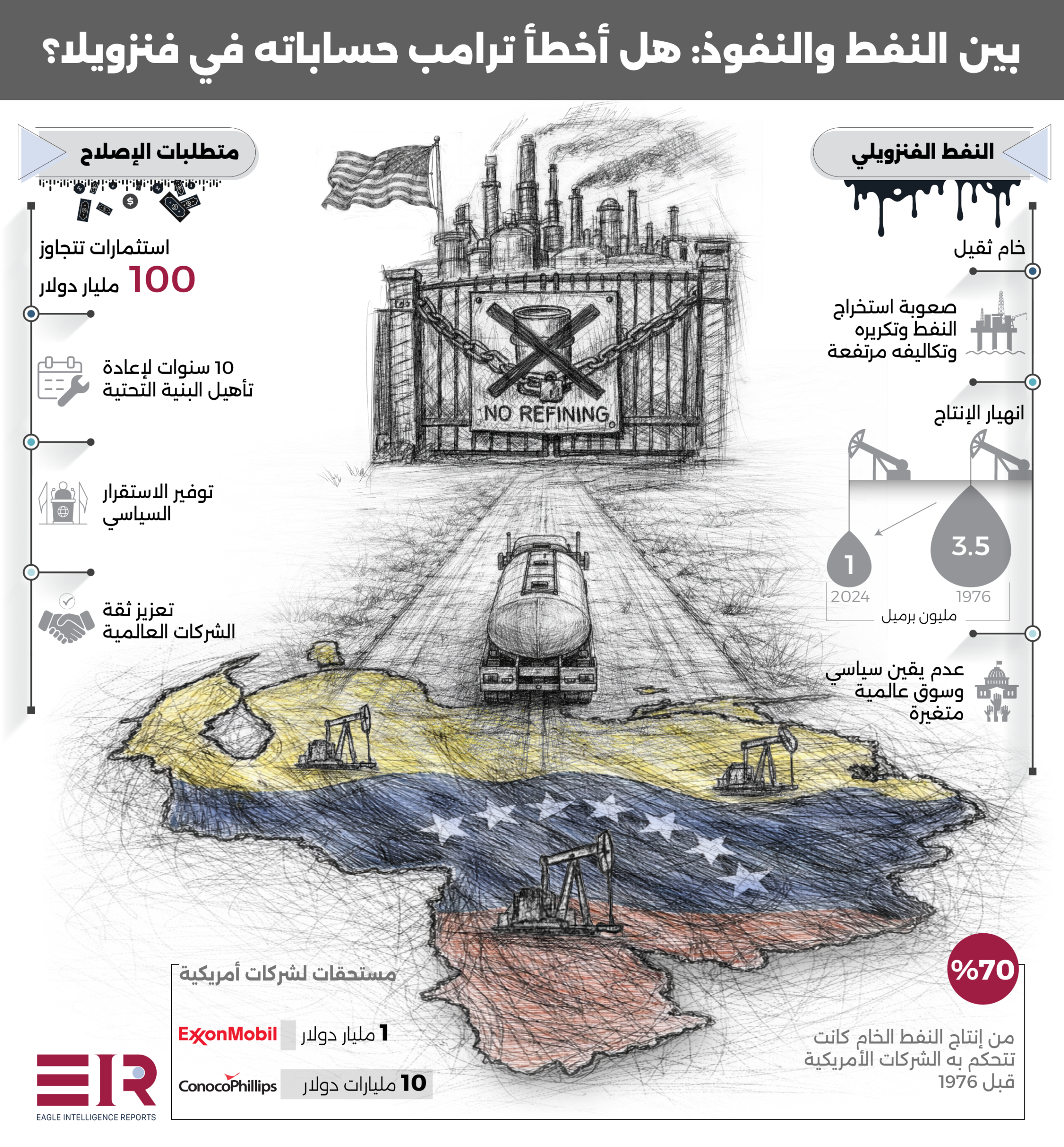 يفتخر الرئيس الأمريكي دونالد ترامب بتنفيذ عملية عسكرية ناجحة داخل فنزويلا أسفرت عن اعتقال الرئيس نيكولاس مادورو وزوجته سيليا فلوريس، غير أن تصريحاته بشأن جاهزية شركات النفط الأمريكية الكبرى للعمل هناك واستعدادها لاستثمار الموارد الضخمة اللازمة لإعادة إحياء قطاع النفط تبدو متعجلة وتفتقر إلى الواقعية، لقراءة التحليل كاملاً إضغط هنا.