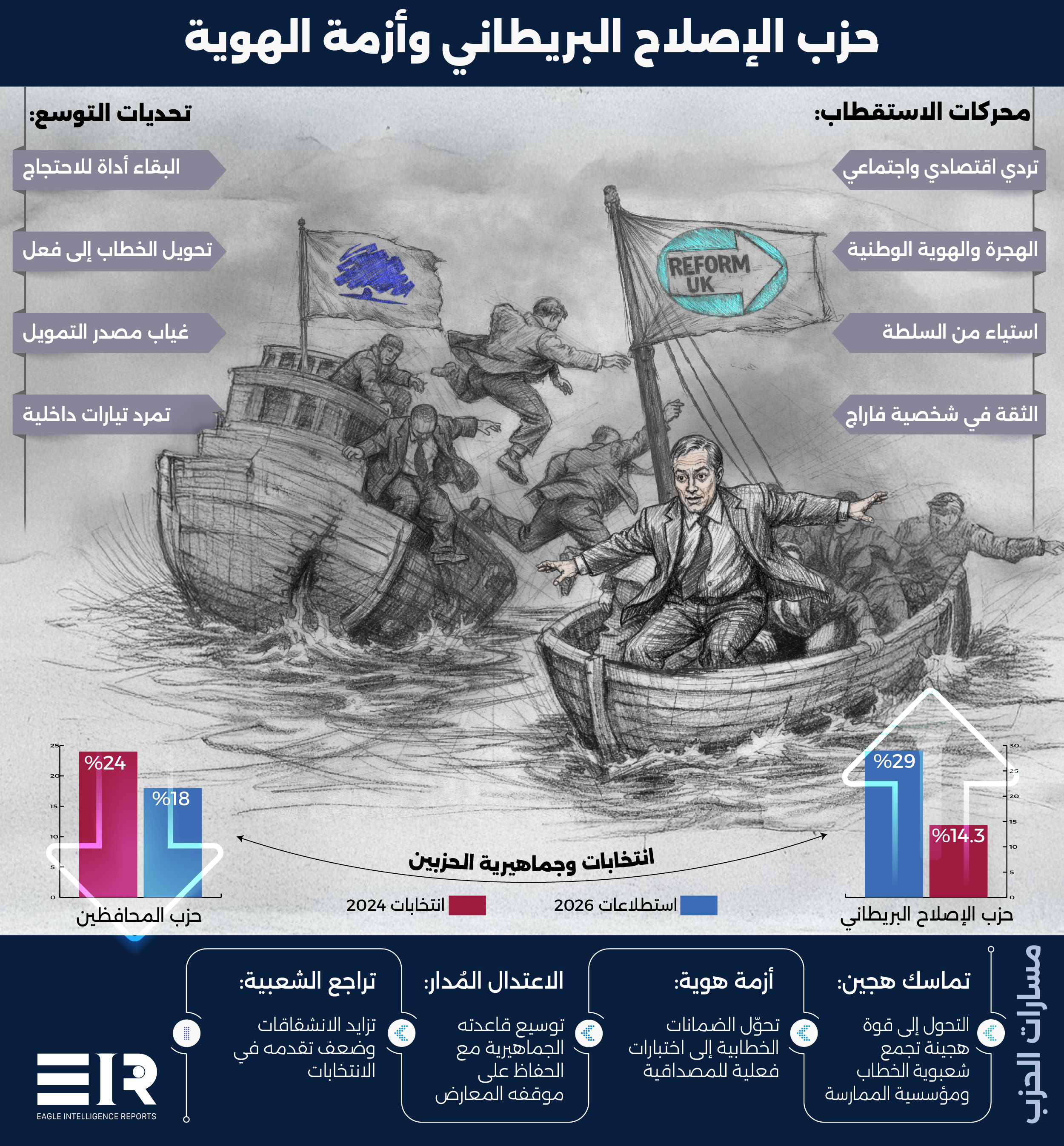كل هذه التطورات تحمل تداعيات مهمة، لا سيما أن الأحزاب الشعبوية التي تنجح في توسيع قاعدة تأييدها غالباً ما تواجه تمرداً داخلياً من تيارات ترى أن المشروع فقد صلابته المبدئية، ولكن مع استيعاب حزب الإصلاح للنواب المحافظين السابقين، يواجه خطر إبعاد أعضاء انضموا إلى الحزب بسبب مواقفه الأكثر راديكالية، لا سيما في قضايا الهجرة، فبالنسبة لهؤلاء المؤيدين، لا يتمثل هدف الحزب في الحكم بفعالية، بل في البقاء أداة للاحتجاج والغضب والمواجهة الشكلية.