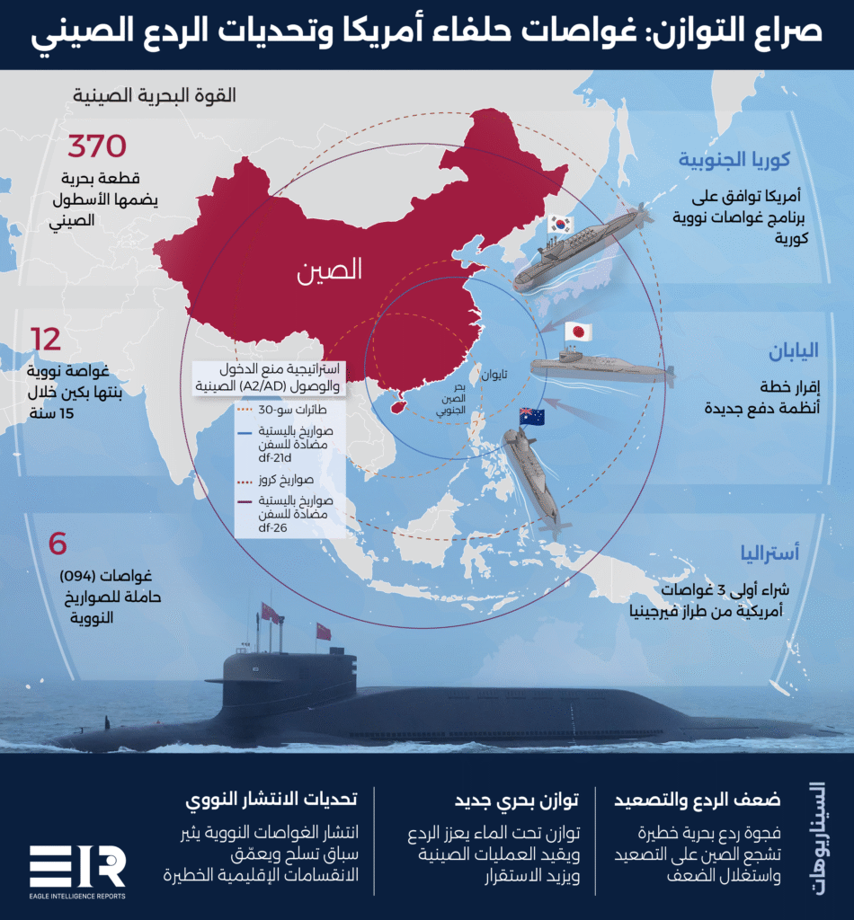 تصاعد القدرات البحرية الصينية أثار نقاشات استراتيجية واسعة بين حلفاء واشنطن في منطقة آسيا والمحيط الهادئ حول ضرورة تطويرهم غواصات نووية محلية