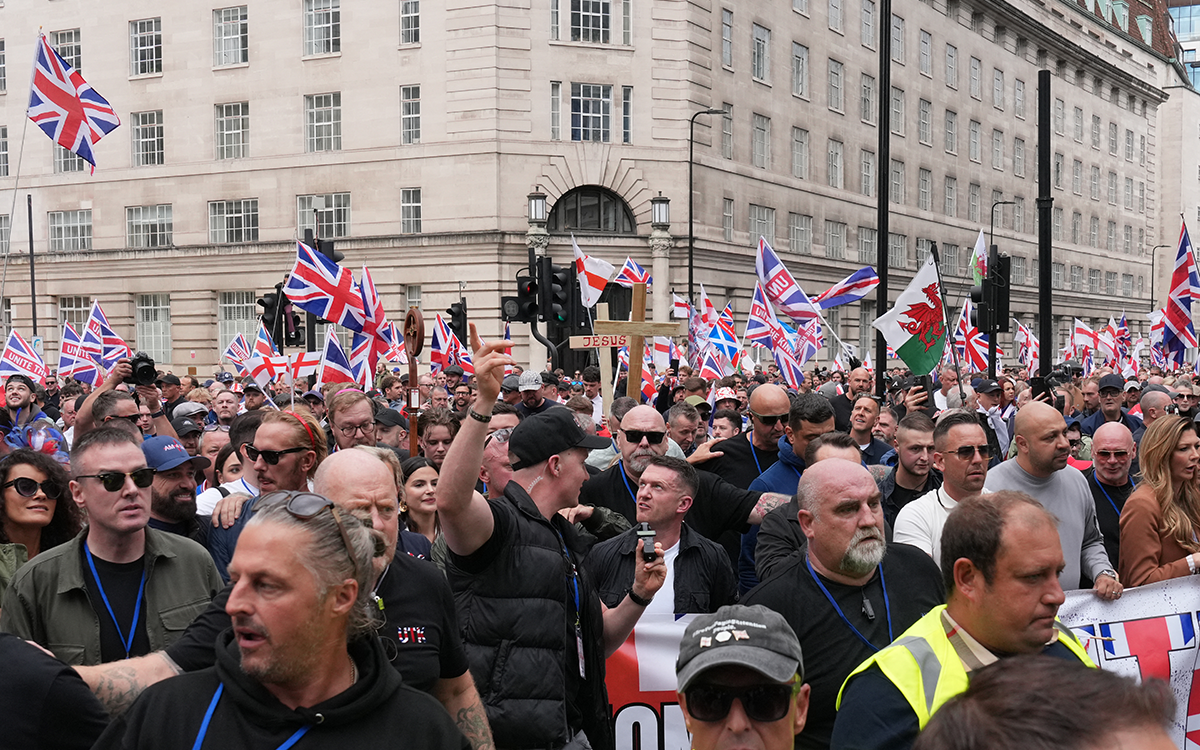 بالتالي، لم تندلع مظاهرة سبتمبر المذكورة أعلاه بشكل عفوي، بل كانت تتويجاً لعام من المواجهات المحلية الأصغر حجماً مثل: تجمعات غاضبة أمام الفنادق، ولافتات أمام مراكز اللجوء، وشعارات تردد في ساحات المدن الرئيسية، حيث وفرت هذا الأحداث بيئة خصبة لهذه الحركات لتنمو بشكل أسرع، من حيث الأسماء والشبكات والعبارات التي تعكس غضب الشارع، ومع تجمع أكثر من 100 ألف شخص في وسط لندن، كان كل شيء للمظاهرة معد سلفاً، أما المتظاهرون المضادون فلم يتجاوز عددهم سوى بضعة آلاف، وكانت الشرطة منتشرة على طول شارع “وايت هول”؛ ما أسفر عن إصابة 26 ضابطاً واعتقال 25 شخصاً.