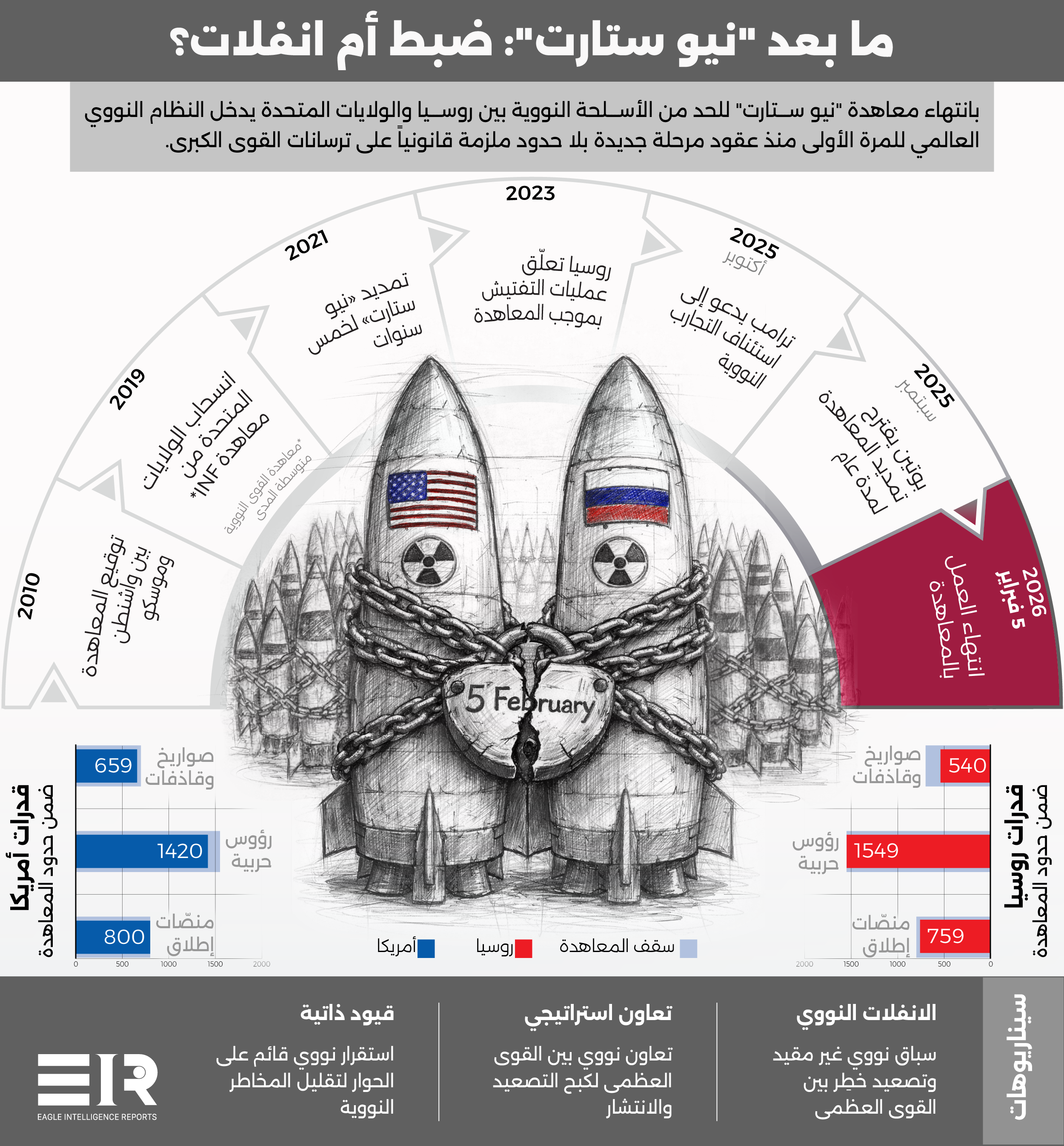 بالمحصلة، يمثّل انتهاء سريان معاهدة “نيو ستارت”أحدث مؤشر على تآكل نظم ضبط التسلح النووي، ومع ذلك، قد يُسهم ظهور عصر جديد يتميز بتعدد الدول المسلحة نووياً وظهور تقنيات استراتيجية ذات تأثير بالغ في تعزيز الاستقرار الاستراتيجي بصورة مفارقة، من خلال خلق مستوى من التعقيد وعدم اليقين يقلّل من ثقة القادة في إمكانية تحقيق النصر عبر التصعيد النووي أو الحرب.